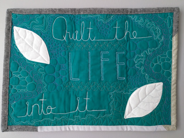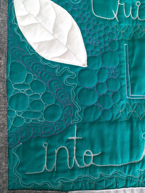 It's quilted all in 50 weight Aurifil thread; sometimes I quilted over motifs so they stuck out more. I used 2600 (dove gray) for the letters, plus 2024 (white), 2850 (green), 2540 (medium purple), 2805 (blue green), and finally 2715 (light blue) for the word "life."
