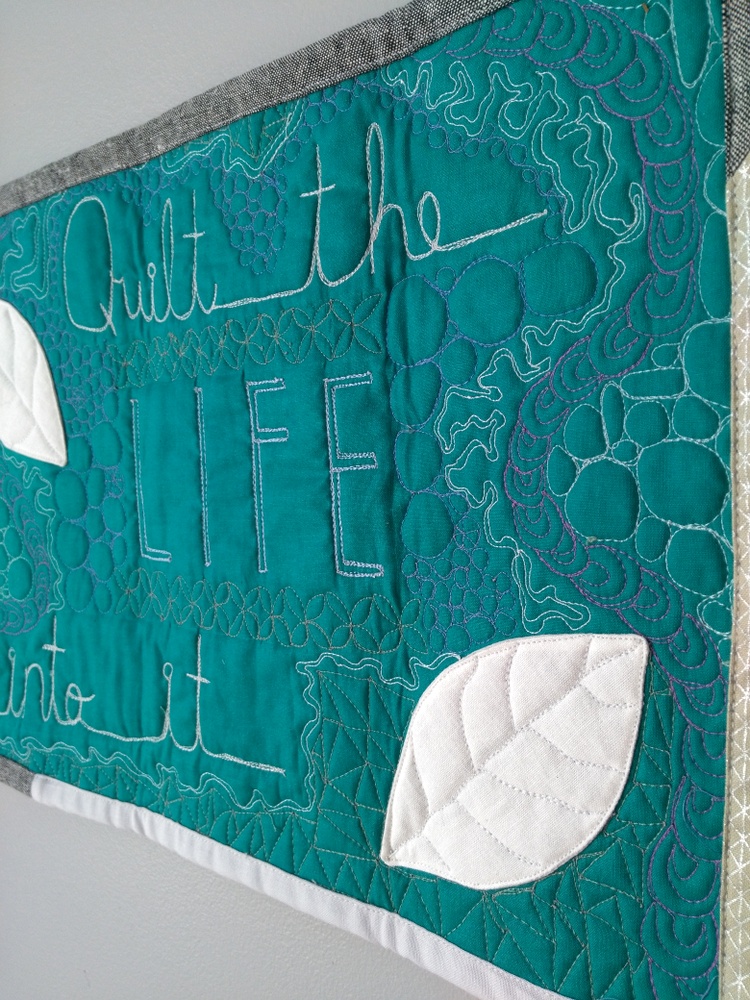 It's quilted all in 50 weight Aurifil thread; sometimes I quilted over motifs so they stuck out more. I used 2600 (dove gray) for the letters, plus 2024 (white), 2850 (green), 2540 (medium purple), 2805 (blue green), and finally 2715 (light blue) for the word "life."