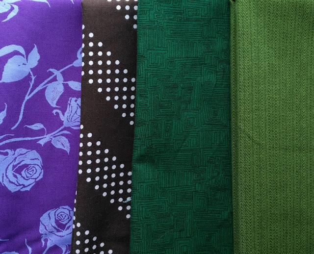 Finally, well, my ardor for purple always wins, and when I saw this brand new lavender on deep purple rose print, it jumped onto the cutting table before I could even think about how much purple fabric I have. This print reminds me a lot of Anna Maria Horner's gorgeous, saturated roses.