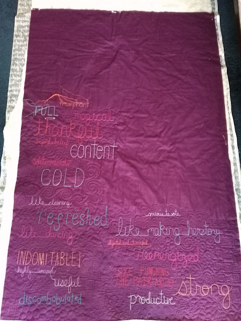 The quilt is half done now, after writing 1 encapsulating phrase each day for three weeks (has it really been three weeks since I started and since the election?)! It helps that I've been filling in the surrounding negative space every weekend. The project will take me right past my birthday on December 17 - which was completely unintentional, but I'm glad of it!