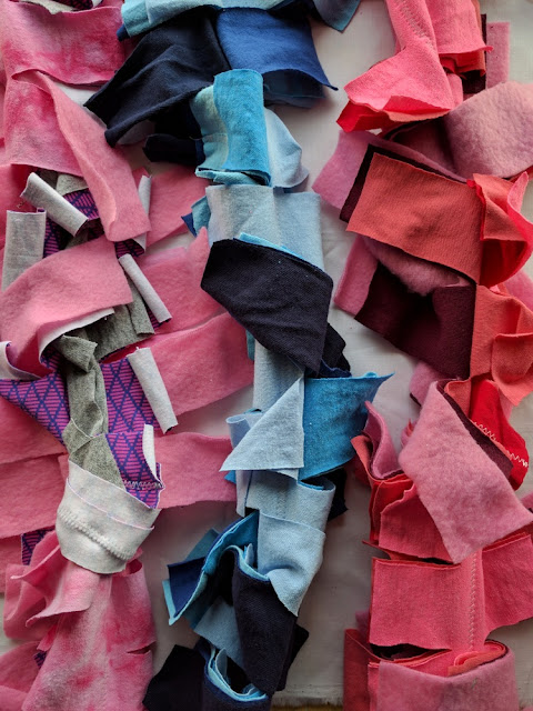 I also made some scarves out of knit fabric for my nieces, using Alabama Stitch Book by Natalie Chanin with Stacie Stukin. Thanks to Maggie @squishythings, my guild friend, for lending it to me. Two things about these scarves: they look adorable (if I may say so myself - see below), and they were entirely made from scraps, including several t-shirts.