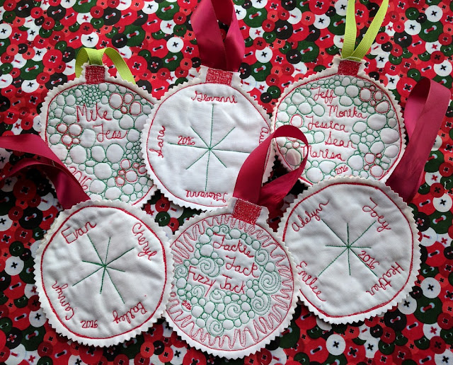 This was the first year I made ornaments for all of the families within my family. I hope to do this every year. I used this tutorial by Devoted Quilter (Free Motion Quilted ornaments). I collect ornaments and many of my family members do, too.
