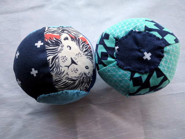 What do you make or give a 1 year old boy? This year, I made fabric balls for the first time using this tutorial and template from Stitches and Love; the first one took 10 minutes, so I made a second one! I gathered up my Cotton and Steel fabrics, Poly-fil, and some jingle bells to add to the inside. My husband thought they were from the store, and I was pleased to tell him that I had made them myself. They are sewn together tightly and accurately, so I'm not worried about anything getting out (and if it does, it will be a quick and easy fix). I hope my nephew enjoys playing with them at home; he definitely enjoyed them yesterday at Christmas. For reference, they fit right in my hand!