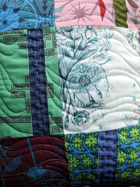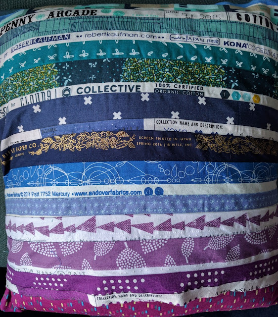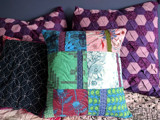Instead of being super scrappy and possibly complicated, I decided a pillow with simple improvised strips would do the trick. Sonia loves a cool color palette like me, so I could easy just keep this pillow for myself! Heh. I didn't, promise. Some dense hand-stitching provide a unique texture to the strip sections (I even used some of my Loominous scraps here - Sonia should know that I REALLY love her!). I'm still fascinated by the combination of hand and machine stitching. This will be a theme in my work for a long time, I'm sure. I just want to try everything.