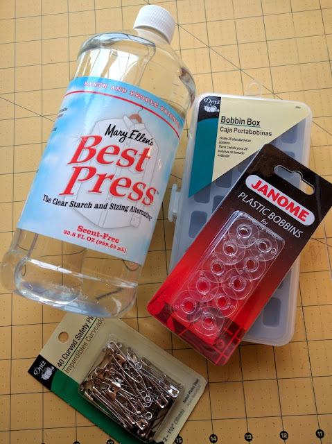 That wasn't all. First, I realized I was getting quite low on Best Press (I buy big refill bottles). Then it was bobbins - I was working on so many projects that my bobbins were nearly all used up. With that I threw in a new bobbbin case (not pictured - I ended up buying even more bobbins after this! I do a lot of quilting!). My safety pins, which I use mostly for basting, were dull and well-used. Why not?