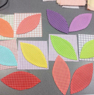 My favorite part about the first section of this class is marveling over students' color combinations (everyone else loves looking at fabric, too!). Once we've discussed the general idea of making a quilt like this, I lead students through orange peel making and everyone gets to work. There's usually not enough time to make too many peels - if the class is over two sessions, students have to finish their homework (make the rest of their blocks).
