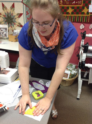 My favorite part about the first section of this class is marveling over students' color combinations (everyone else loves looking at fabric, too!). Once we've discussed the general idea of making a quilt like this, I lead students through orange peel making and everyone gets to work. There's usually not enough time to make too many peels - if the class is over two sessions, students have to finish their homework (make the rest of their blocks).