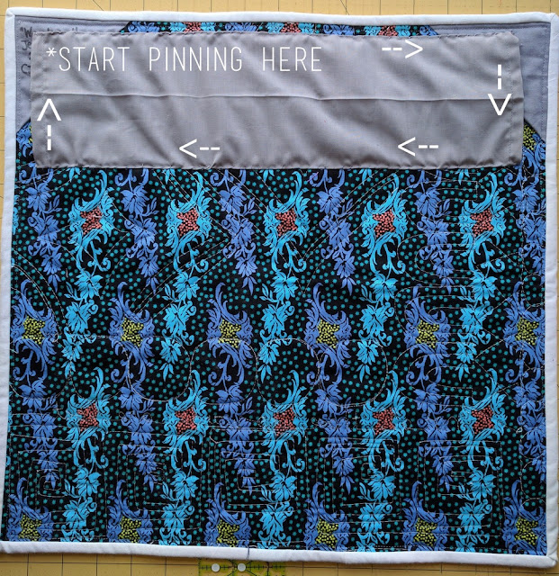 - Start pinning and sewing in the same place. See the diagram above - your quilt sleeve gets pinned less than an inch below the top of your quilt, on the back. If you're looking at the back, pin from the top left corner, across towards the right, down, and across to the left, back to where you started. This is the way I've found works best. Whatever you do, I would not recommend sewing the bottom part of the sleeve on first.
