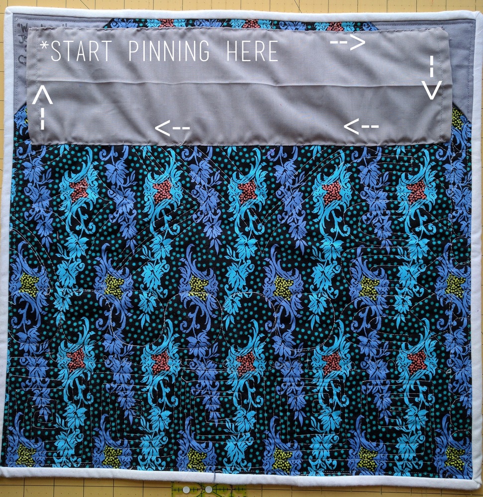 - Start pinning and sewing in the same place. See the diagram above - your quilt sleeve gets pinned less than an inch below the top of your quilt, on the back. If you're looking at the back, pin from the top left corner, across towards the right, down, and across to the left, back to where you started. This is the way I've found works best. Whatever you do, I would not recommend sewing the bottom part of the sleeve on first.