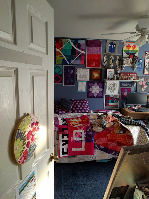 There's the quilt on top of my mini quilt wall, ready to greet me every day. It's happy, fulfilling sight!
