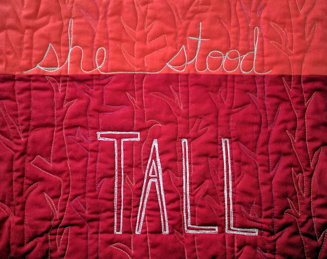 To accompany the word "tall," I traced out some organic trees with my handy Fons and Porter chalk pencils, which I then quilted over using several different threads (Aurifil 1100, 2250, and 2277). My favorite ones are the pink trees.