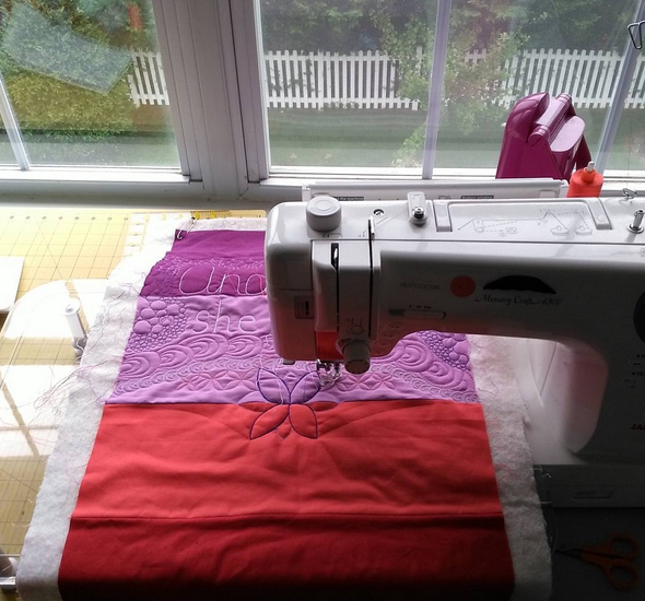 ReplyDeleteMy mother and I made a king-size whole quilt for my sister and brother-in-law in 1971. It had no words on it, but it was purple! And we hand quilted roses on it ourselves. We made a quilting frame out of 2x4s and clamps, and propped it on sawhorses. We would work on it outside until it got smaller (rolled up) and then we finished it inside my house. That was the first quilt that I ever did the quilting on.