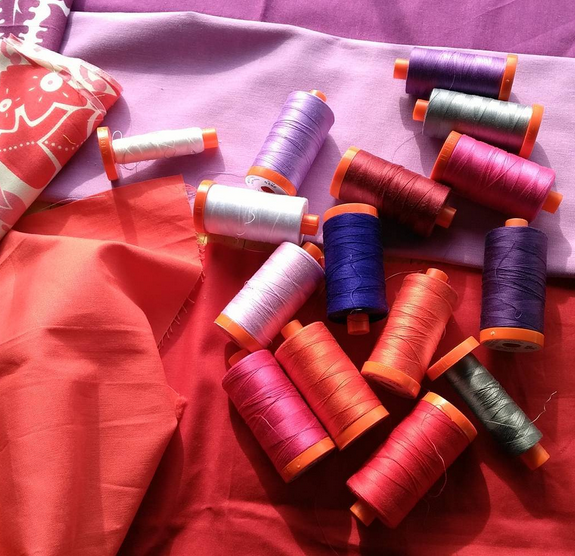 I used a ton of different threads to achieve the balance I was looking for. My favorite was the variegated purple thread (3840), which glimmers at a distance. You can see it in the "organic"/imperfect straight lines at the right of the picture below. It's really hard to photograph accurately; the thread is much better seen in person. Thank you to Aurifil for allowing me a chance to work with it.