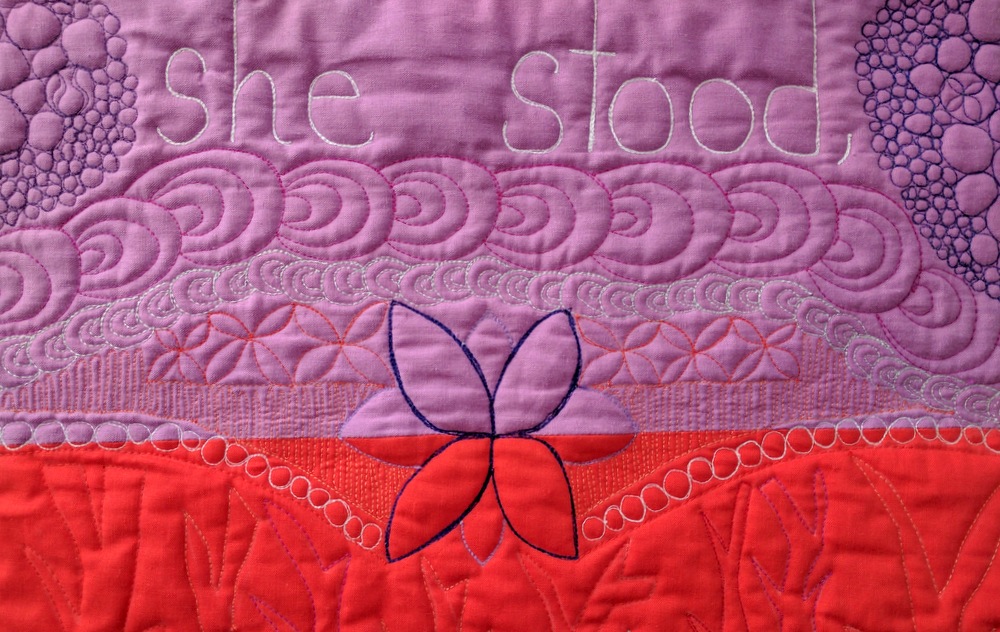 To accompany the word "tall," I traced out some organic trees with my handy Fons and Porter chalk pencils, which I then quilted over using several different threads (Aurifil 1100, 2250, and 2277). My favorite ones are the pink trees.