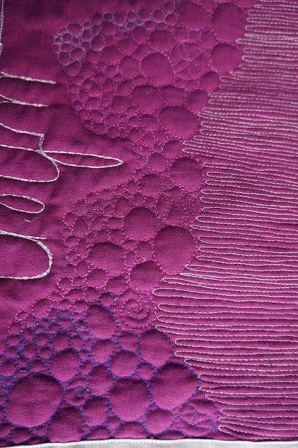 I used a ton of different threads to achieve the balance I was looking for. My favorite was the variegated purple thread (3840), which glimmers at a distance. You can see it in the "organic"/imperfect straight lines at the right of the picture below. It's really hard to photograph accurately; the thread is much better seen in person. Thank you to Aurifil for allowing me a chance to work with it.
