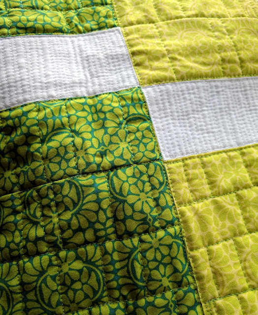 The white solid from Colors for Quilters serves to contrast, and I quilted it densely with Aurifil 2024 (white) to emphasize the pinwheel design. For the background, I quilted an improv-y brick pattern using my free motion foot and Aurifil 5017, a lovely lime green. I had a lot of trouble figuring out how to quilt this one, but ultimately, I wanted the spokes of the pinwheel to shine.