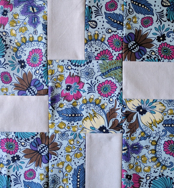 I decided to use two green prints ("Libby's Lace" from the Liberty Garden) because they are so springy (plus, Greenery is the Pantone Color of the Year!). To give this mini quilt some depth, I set the two different greens side by side. It's a different effect than if they had been placed diagonally across from each other.