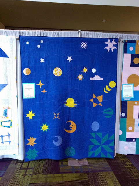 This was probably my favorite quilt in the whole show. It was in the "Use of Negative Space" category; I'm assuming the quilting was the reason. Check out the sun and moon - they are subtle but they add to the picture so beautifully. I love the modern traditional look of this quilt (taking the plus block and morphing it into something wholly different). This quilt was on a side aisle; in my quilt show, it would have been front and center. ;) (this is not to say the quilts were placed according to the show organizers' liking). :P