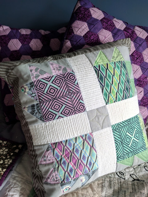 My secret partner was Hayley from the Philly guild, who I hadn't known before. Hayley doesn't have much of her work online so at first it was hard to decide what to make her. Besides other smaller gifts and fabric, I ended up sewing this bear paw pillow of Tula Pink fabrics (she mentioned loving modern traditionalism, Tula, mint green, and lilac).