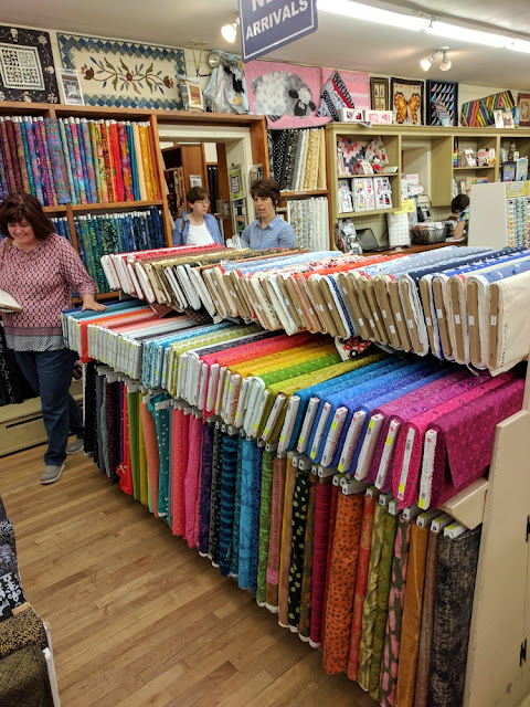 The next morning, I had a lovely breakfast at a local joint with Linda and Susan from my guild, plus Ann from the Lancaster MQG. Then, we went fabric shopping at two of our sponsoring shops: Zook's and Old Country Store (below, where you can see Lin's pure excitement). Fabric shopping in Lancaster is like stepping onto a fabric-covered planet. It's EVERYWHERE.
