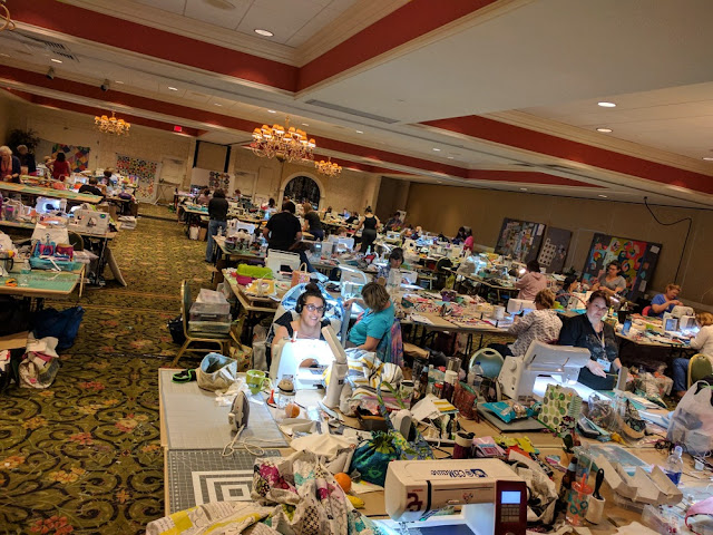 Once I arrived Friday night, we had a cocktail hour and show and tell. It was great to catch up with my own guild (I missed our last meeting, so it's been a month and half since I last saw them - and after 5 years together, some of us are very close!). I also had the opportunity to greet members of other MQGs that I've met through this retreat and teaching. It was a great way to start off a night of sewing! Thank you so much to the sponsors of the cocktail hour: 1 Choice 4 Quilting, Fabricworm, Gotham Quilts, Pink Door Fabrics, and Del Ray Fabrics!