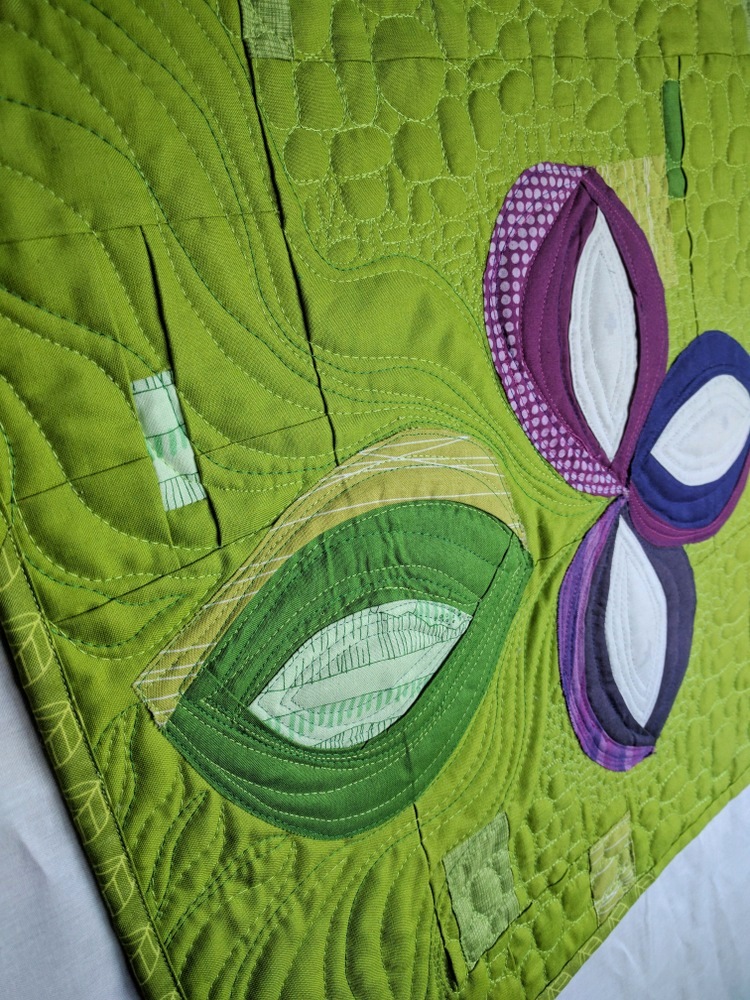 I had forgotten how much I LOVE sewing improv curves, and, well, curves in general. Once you get the hang of it, it's quite fun. So I set to work creating 3 white and purple petals and one green petal falling off (why purple? Because it's the best color, and it looks amazing with green!). I adhered Heat N Bond Lite to the backs of the peels before raw-edge-appliqueing them onto an improvised green background. Some of the background scraps disappeared under the applique, but I was prepared for that.