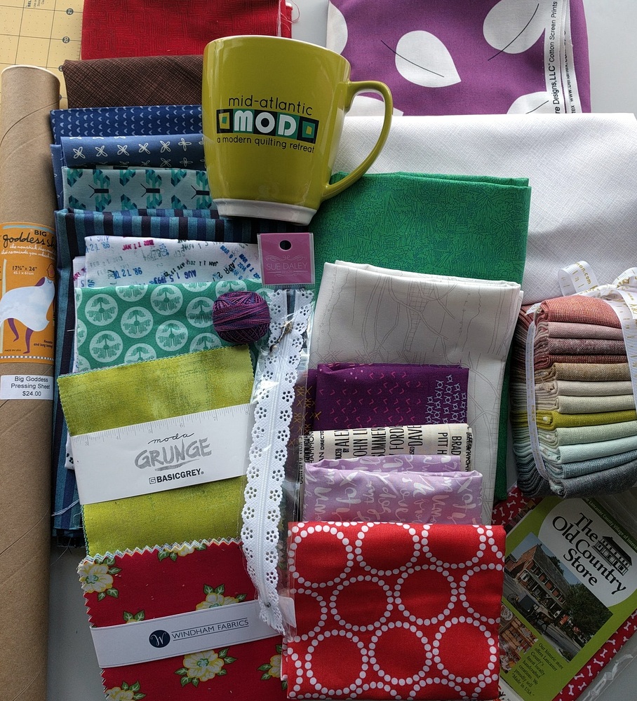 My favorites amongst these: the Mod mug (AH! I love big mugs), the Goddess Sheet (won in a giveaway by my guild friend Michele and gifted to me - I used one for the first time and loved it - thank you for your kindness, Michele!), top purple leaf fabric from Zooks (it's so me), and the Literary fabric (library book dates) I found at Old Country Store.