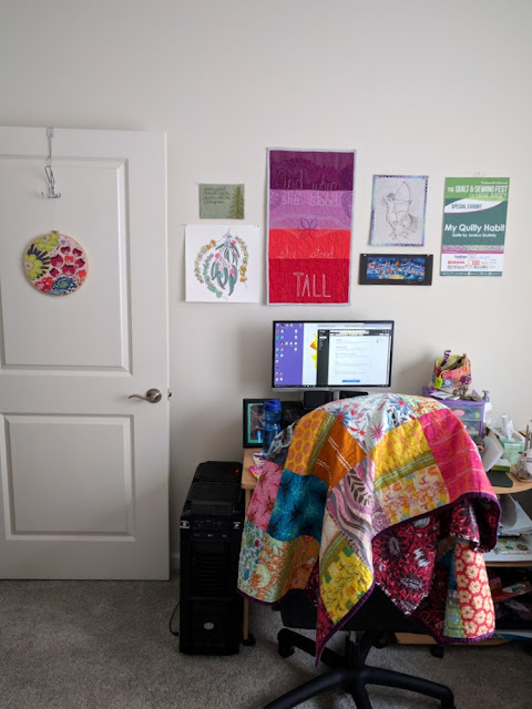 My space has a two-table setup against the windows. On the other walls of the room sit my ironing board (next to my sewing machine) and desk (below). All of this is very flexible, in case we have guests or another need for the room. It's just the kind of room I need right now to finish up my book.