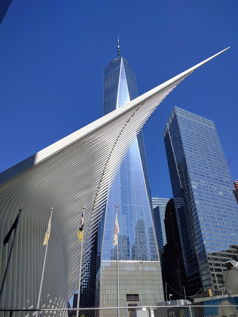 I had never before seen the Oculus completed (new World Trade Center train/metro station) near the new One World Trade Center building. We hopped off the subway and this perspective took my breath away. So many curves and lines to consider.