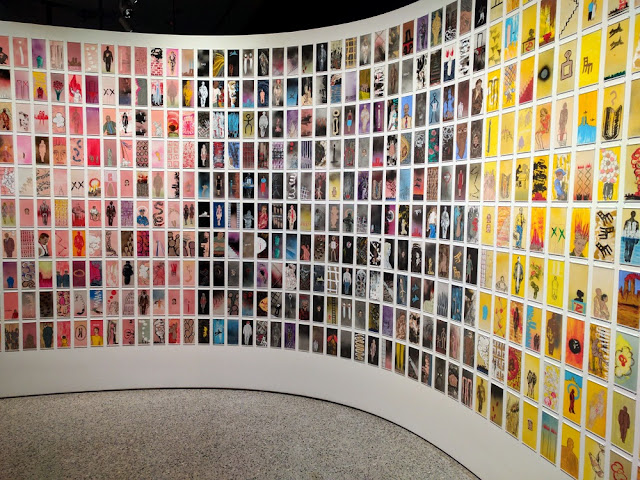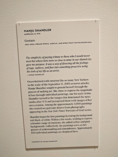 Finally, inside the 9/11 Memorial Museum, I stumbled upon a small collection of art relating to the events of 9/11/01. This section, over 850 paintings by Manju Shandler, stopped me in my tracks (see more below). This was one of two walls. Not only was I impressed by the details but the effect of color gradation and the curvature of the walls. It really made for a unique, solemn viewing experience.