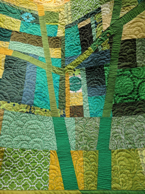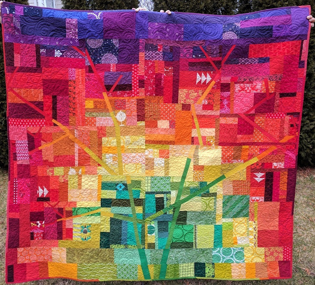 This quilt was painstakingly built on two design walls, and then joined in the middle (at about the halfway point). I used my planned improvisation method, brick-by-brick, to piece together a tree in five colors. In classes, I discuss how to piece together improvisationally to achieve a larger picture. My favorite parts of the quilt are the small scraps of fabric that stand out because they slightly pop out from their surroundings. I'm really glad I persevered to create this quilt.