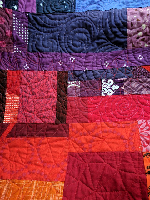 I quilted it with five different motifs that overlap slightly - one for each color and with matching Aurifil thread to boot. It was a challenge but altogether, this part of the process brought me lots of joy. That's the best I can ask for! That's why I quilt. It might be almost time for another huge challenging piece like this one.