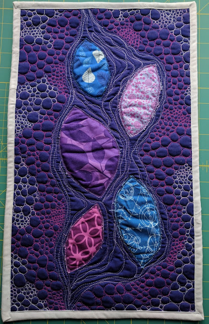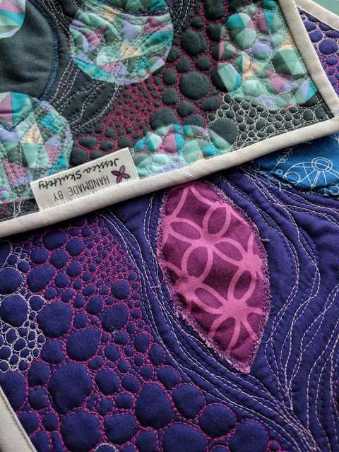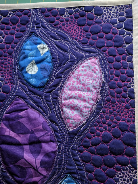 I found out with this quilt that quilting REALLY small pebbles (see above) is NOT an easy feat, even on a small mini quilt! It took over 3 hours but admittedly it was meditative and enjoyable. I used Aurifil 1100 (Red Plum) and 3840 (variegated purple - French Lilac) on the pebbles - it's really hard to get a picture of how they really look in person, especially the variegated ones!