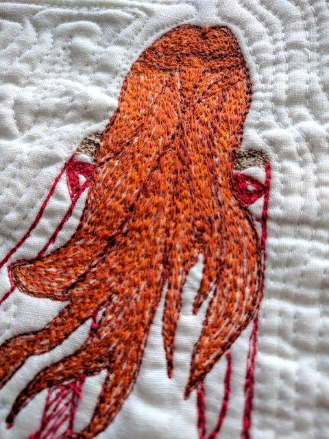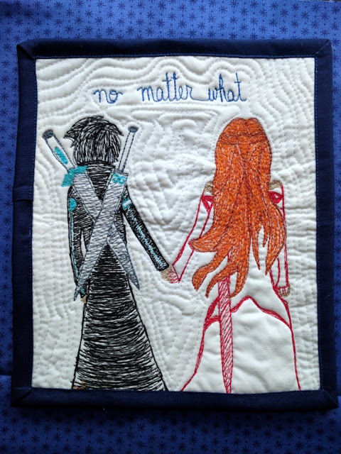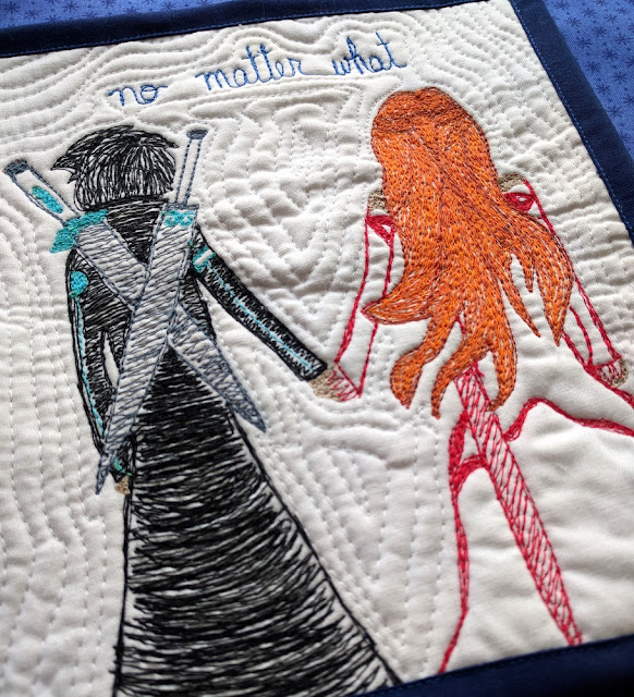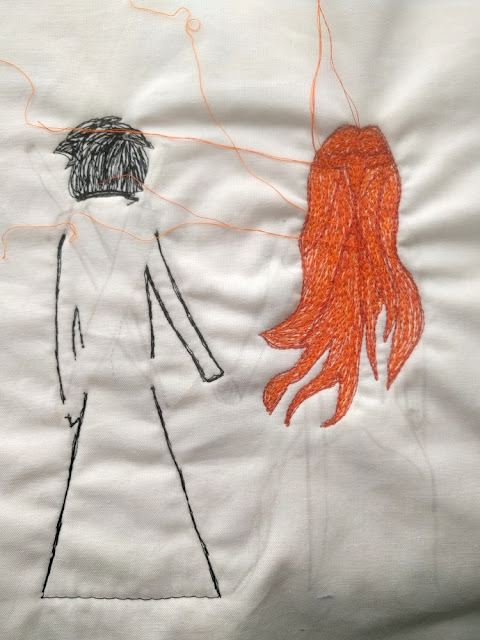 Asuna's hair was the really exciting challenge I wanted to tackle in this piece. It's a beautiful, bright, orange-y shade (here's a good photo); after tracing the outline with a black chalk pencil, I quilted with a dark orange thread (Aurifil 2350). Then, I filled in her hair with two brighter, lighter oranges (Aurifil 2240 and 1133). I wasn't going for perfection with this thread painting. If I had quilted over it a couple more times, it would look even more full, but I wanted it to match the same messy style as Kirito's hair. Plus, in this scene, the characters are fading.