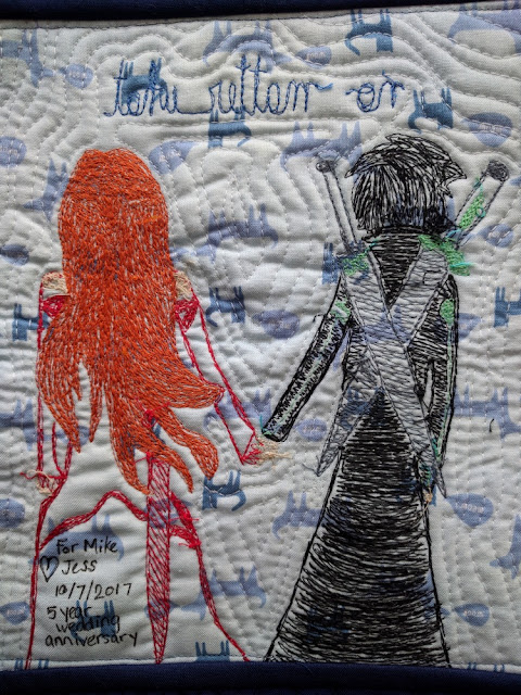 This is what the back looks like. I don't always cut all the little threads (and I certainly don't bury them on something this small). I used a fabric specifically bought for Mike (cats and dogs), and in my rush to start quilting Asuna's hair, I didn't realize it was upside down! :)