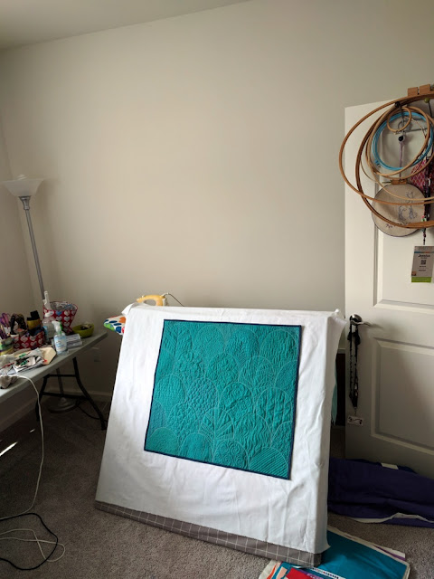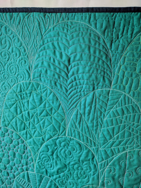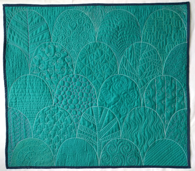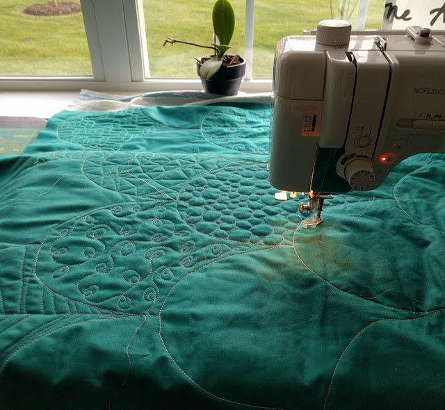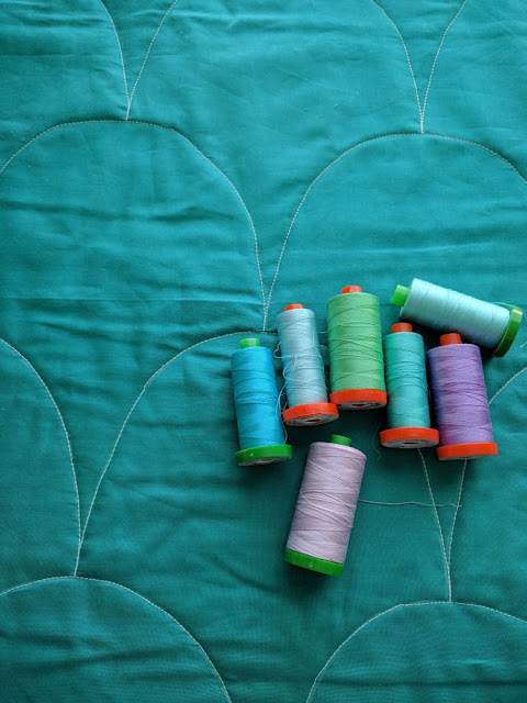 After creating a quick cardboard template, tracing, and quilting the clamshell lines (see below), I chose a bunch of threads that would contrast enough with the teal (Free Spirit Spruce solid): Aurifil threads 5006 (light turquoise), 2520 (violet), 2710 (light robin's egg), 1148 (light jade), 3840 (French lilac, purple variegated), 2860 (light emerald), and 2810 (turquoise). I've only made one wholecloth quilt larger than this, and it was quite different, but the color-choosing process was similar. Wholecloth quilts need lots of texture, and to me, color and contrast are the cherries on top.