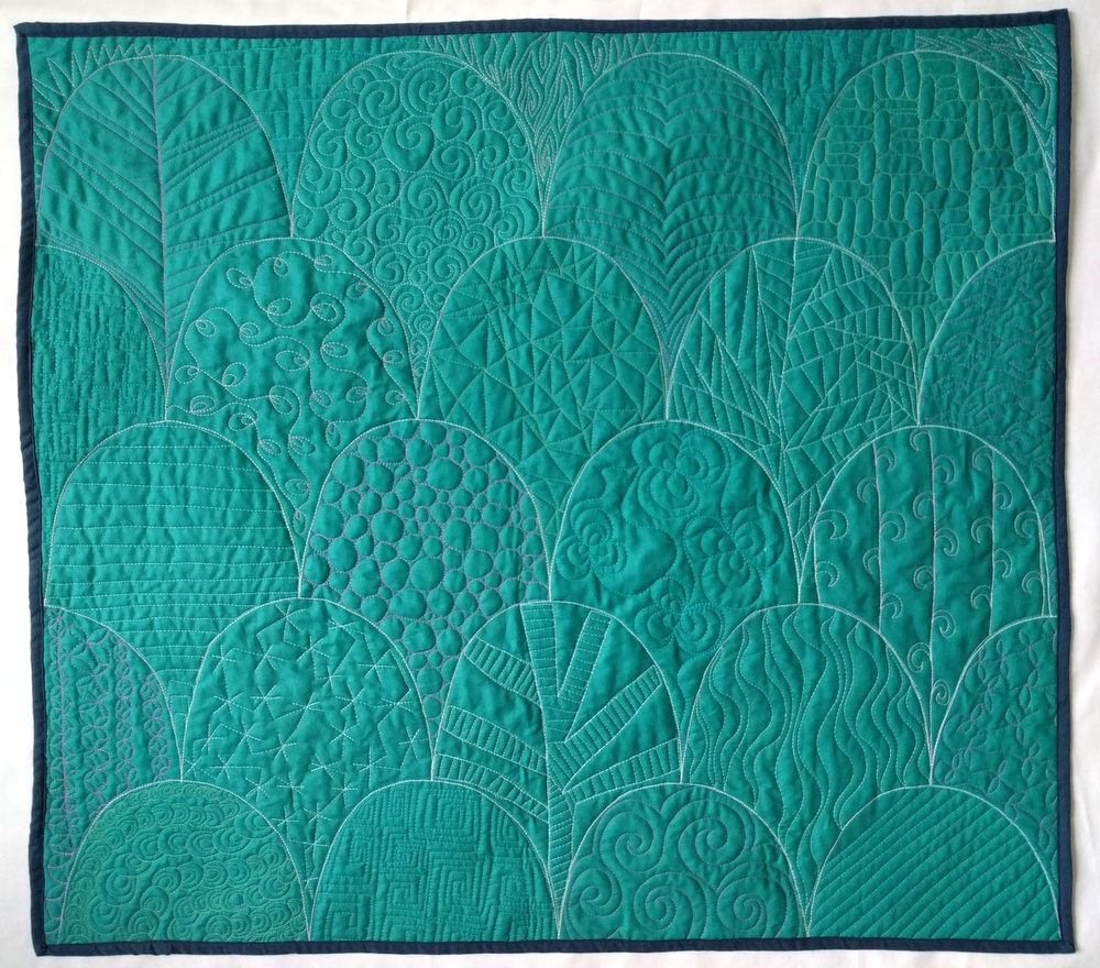 After creating a quick cardboard template, tracing, and quilting the clamshell lines (see below), I chose a bunch of threads that would contrast enough with the teal (Free Spirit Spruce solid): Aurifil threads 5006 (light turquoise), 2520 (violet), 2710 (light robin's egg), 1148 (light jade), 3840 (French lilac, purple variegated), 2860 (light emerald), and 2810 (turquoise). I've only made one wholecloth quilt larger than this, and it was quite different, but the color-choosing process was similar. Wholecloth quilts need lots of texture, and to me, color and contrast are the cherries on top.