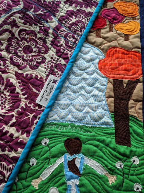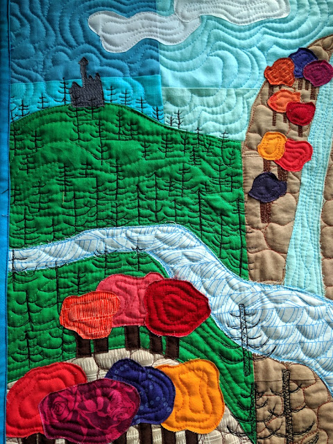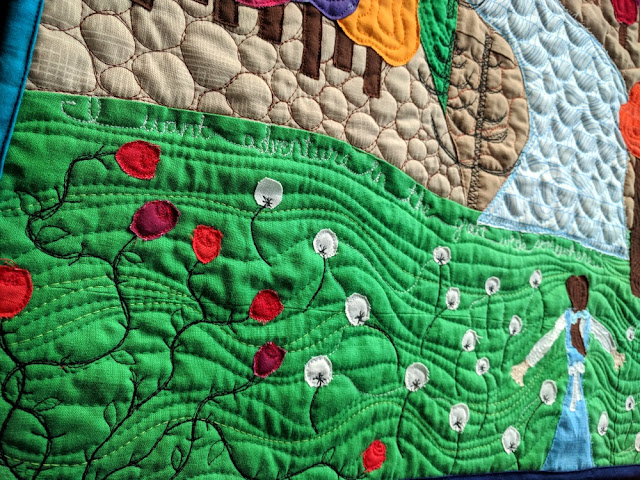 I gladly took a bit of artistic license; for example, the Beast's castle sits in the distance to hint at the upcoming adventure, and I added a growing rose bush to the bottom left corner because... well, have you seen the movie?... roses are an important part of the later plot. This was really fun to free motion quilt in black and then applique. There are also a few trees featuring rose fabric. Sneaky.