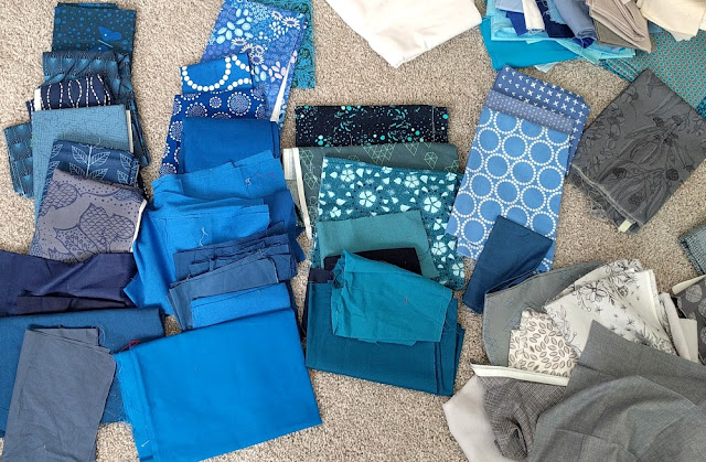 Back when I chose these modern, calm fabrics (in colors the brides chose), I organized blues into 4 color groups. This was mostly instinctual but often directed by warm/cool tones. I wanted the quilt to move from gray in the middle all the way to dark blue on the top and bottom; this design would hopefully emphasize the double wedding ring motif. When I started piecing improvisational waves, I often added in a bit of the next darkest color. This technique ensures that the gradient will change smoothly (versus starkly).