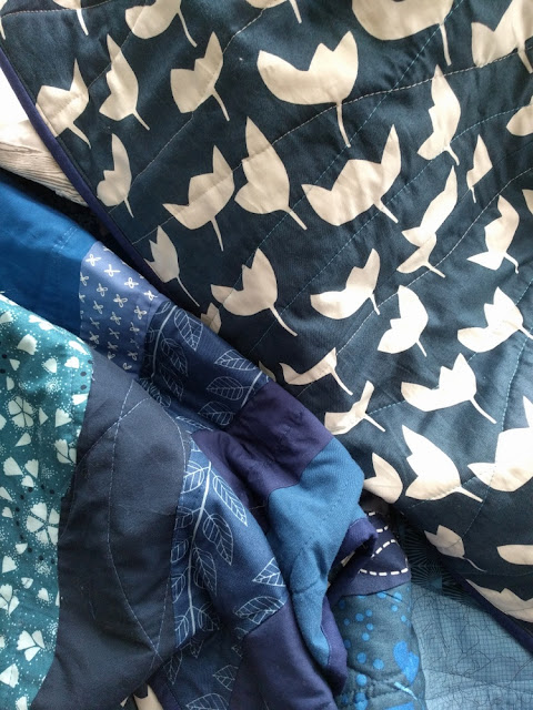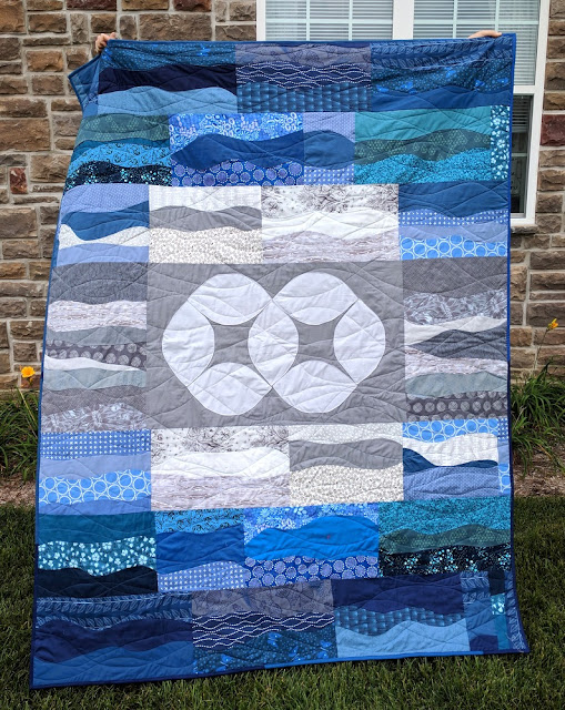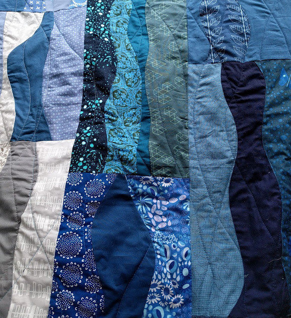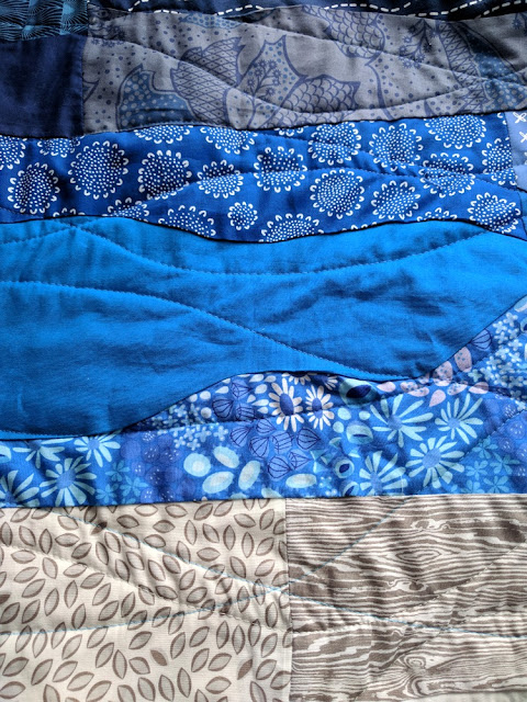 The quilting itself was really fun to do; I used my walking foot to create randomized waves all over. This was the right choice for this quilt (in my mind) because a) it emphasizes the design of the waves (always one of my goals - add to the design instead of take away) and b) it maximizes comfort.