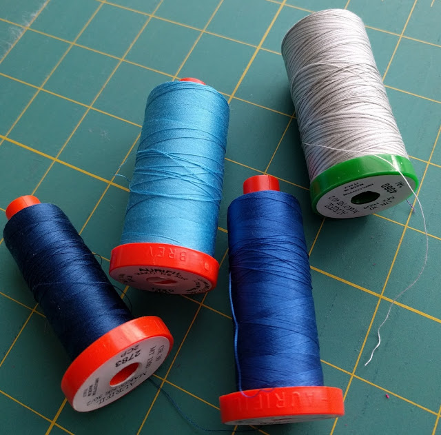 I used a handful of Aurifil threads to make the waves in each section, progressing from light to dark (4060 variegated gray, 2735 medium blue, 2783 medium delft blue, and 1320 medium teal). My most recent exciting thread discovery is that variegated gray thread, which really makes an impact. I just used it for part of another quilt, too!