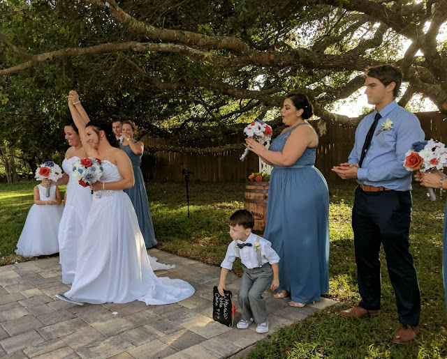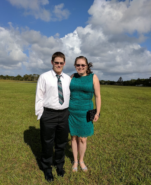 And finally, a picture of the happy couple. We were glad to be a part of the special weekend in Florida! Originally, I planned to pack the quilt with me and gift it to them in person, but it was easier (and cheaper - it's a large lap size) to ship it right before we left. I'm so glad I was able to surprise them with a quilt!