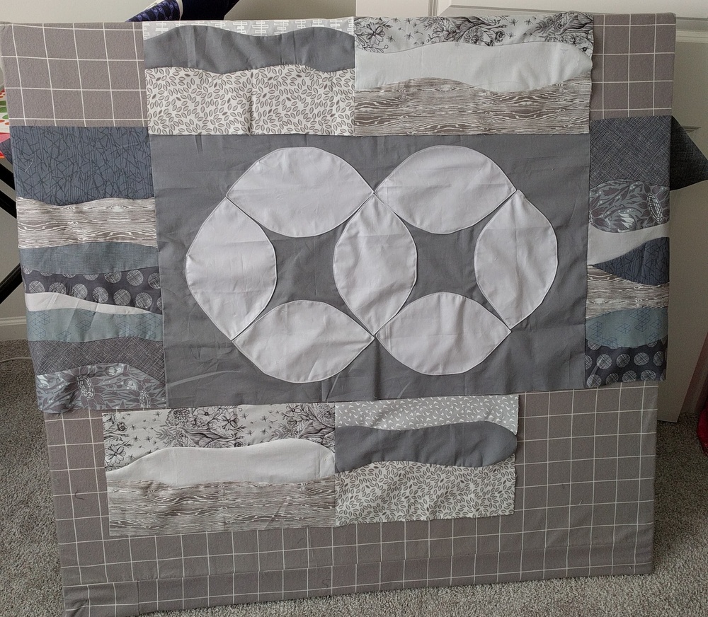 Back when I chose these modern, calm fabrics (in colors the brides chose), I organized blues into 4 color groups. This was mostly instinctual but often directed by warm/cool tones. I wanted the quilt to move from gray in the middle all the way to dark blue on the top and bottom; this design would hopefully emphasize the double wedding ring motif. When I started piecing improvisational waves, I often added in a bit of the next darkest color. This technique ensures that the gradient will change smoothly (versus starkly).