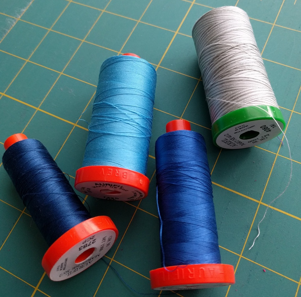 I used a handful of Aurifil threads to make the waves in each section, progressing from light to dark (4060 variegated gray, 2735 medium blue, 2783 medium delft blue, and 1320 medium teal). My most recent exciting thread discovery is that variegated gray thread, which really makes an impact. I just used it for part of another quilt, too!