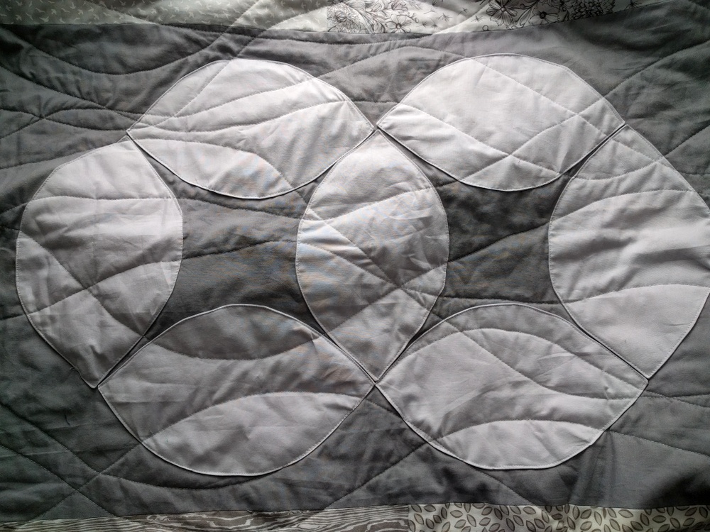 This is my simplified version of the traditional double wedding ring quilt, using orange peels instead (my favorite motif, as you might already know!). I LOVE double wedding ring quilts, but I have no patience to piece one (and the idea for this quilt came about only a couple months before the wedding, so it would have been quite a time crunch). Plus, while I was looking them over, I realized that all the little pieces actually look like large orange peels. I placed the central orange peels like so to mimic the joining of two circles, or two hands, in marriage. Perfect!