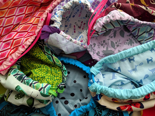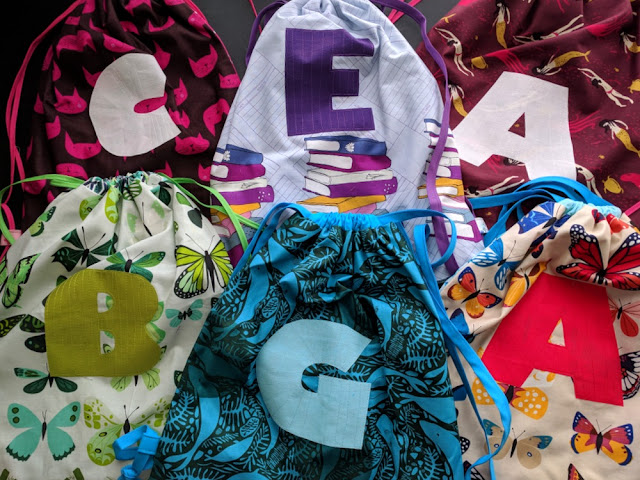 I've done so many different gifts now (my oldest nieces just turned 10 and I've been a part of their lives since they were born), but these personalized drawstring backpacks are amongst my favorites. I attached a note to each one and filled them with little goodies to unwrap (mostly creative stuff). Each bag has specific fabric tailored to each kid, plus their initial. :) I used a great tutorial over at Sew Can She to whip these out in a day at our guild's November sewing retreat. I hope they can and will use them for many years!