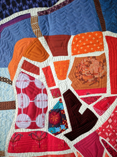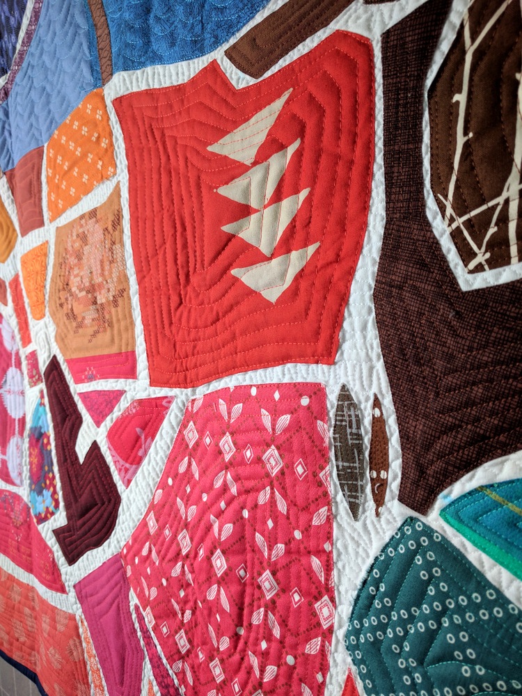 I used several different colors of Aurifil thread to blend with the color sections, trusting that the texture would be the star (2250 Red, 1133 Burnt Orange, 4012 Copper Brown, 1320 Medium Teal, 4225 Eggplant, 1148 Light Jade, and 2024 White). I talked more about my quilting decisions for this quilt here.