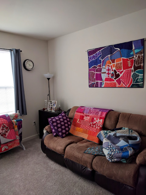 The map was one of the last pieces I planned to hang in our apartment! I love how it looks in our living area. You can even see it when you walk in the front door. The quilt that my guild gifted me (which I use pretty much every day) matches well. One might think these were my colors or something. :)