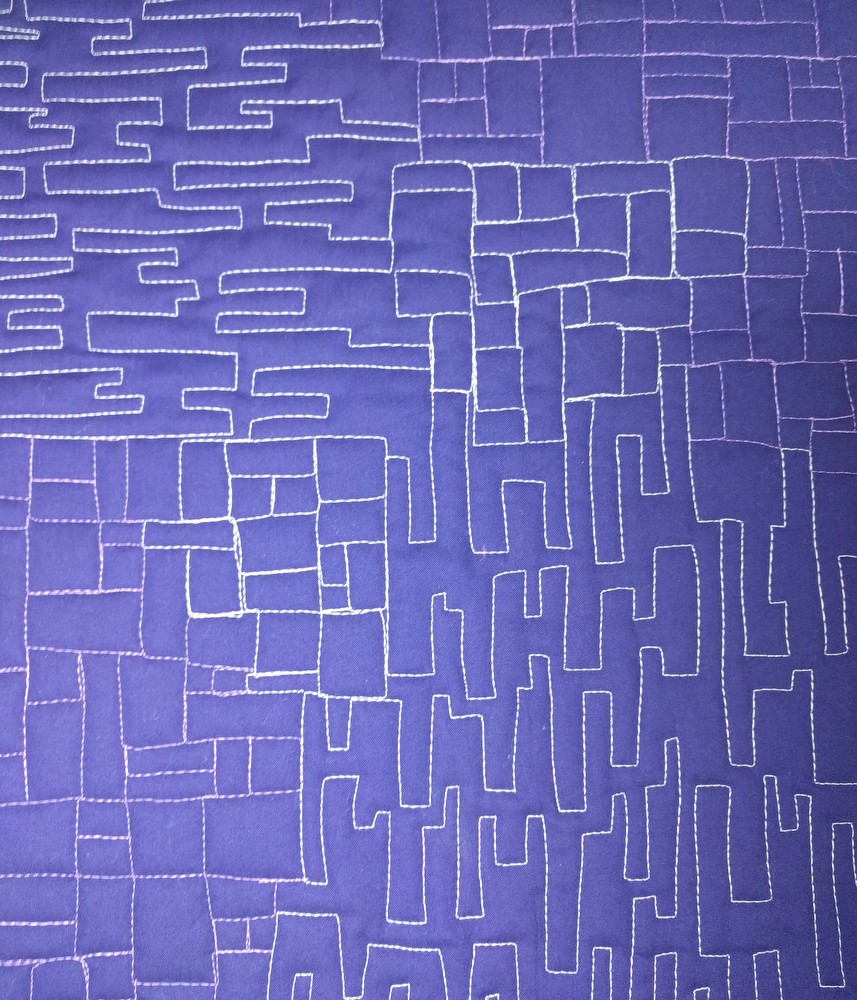 February's theme is "bricks." I really had fun time choosing threads to make sure they contrasted with my fabrics (I want my hard work to show up!). This is a beautiful purple solid from my stash, and I used Aurifil white (2024) and Violet (2520) to quilt it up. I'm trying out 1-2 (dare I say 3?) motifs for each month; I want my sampler quilt to showcase lots of motifs.