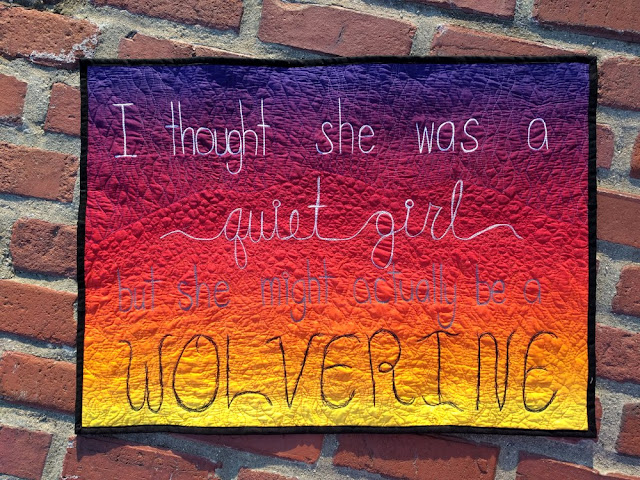 Whenever I quilt words with free motion quilting, I always quilt the words first. I wanted the words "quiet girl" and "wolverine" to stick out most, so I gave them their own lines and created fonts especially for them. I also used four different threads to move the quote along: Aurifil 2024 (white), 2600 (dove gray), 1158 (medium gray - which can be seen better here in certain lights), and 2692 (black).